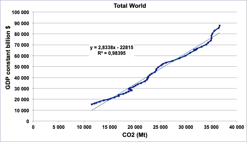 Nous pouvons donc admettre que le CO2 émis par les activités humaines évolue globalement au prorata de l’énergie (NRJ) consommée : si la quantité d’énergie consommée augmente à l’échelle de la planète, alors il en va de même pour les émissions de CO2.